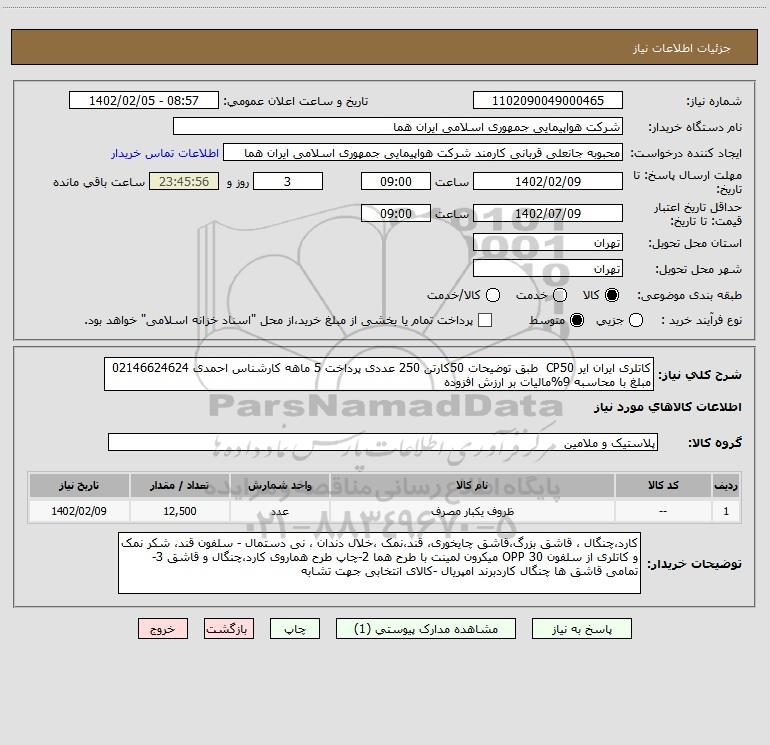 شرح کلی نیاز: کاتلری ایران ایر CP50 طبق توضیحات 50کارتن 250 عددی پرداخت 5 ماهه کارشناس احمدی 02146624624 مبلغ با محاسبه 9%مالیات بر ارزش افزوده