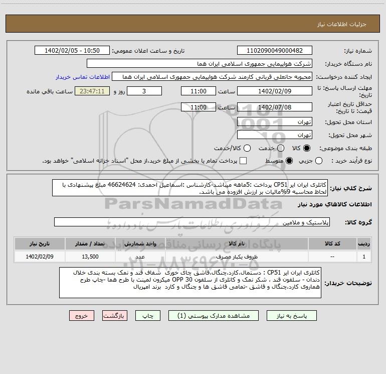 شرح کلی نیاز: کاتلری ایران ایر CP51 پرداخت :5ماهه میباشد-کارشناس :اسماعیل احمدی: 46624624 مبلغ پیشنهادی با لحاظ محاسبه 9%مالیات بر ارزش افزوده می باشد.