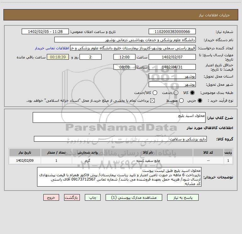 استعلام بها و موضوع استعلام استعلام محلول اسید بلیچ به اطلاع کلیه شرکت‌ها و افراد متخصص واجد شرایط می‌رساند، آگهی گذار در نظر دارد از طریق استعلام بها، نسبت به انتخاب و دریافت پیشنهادات اقدام نماید. این استعلام با کد آگهی ثبت شده در سامانه خبرگزاری پارس نماد : 5742096 منتشر شده است. مشخصات استعلام : تاریخ شروع استعلام: 1402/02/05 آخرین مهلت ارسال پیشنهاد قیمت : 1402/02/07 و محل اجرای پروژه : استان بوشهر میباشد. استعلام قیمت مورد درخواست : استعلام محلول اسید بلیچ با دسته‌بندی‌های تخصصی و گروه های مرتبط : لوازم بهداشتی, استعلام اطلاع رسانی میگردد.