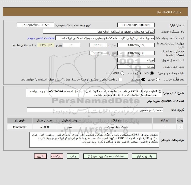 شرح کلی نیاز: کاتلری ایران ایر CP52 -پرداخت:5 ماهه میباشد- کارشناس:اسماعیل احمدی 46624624مبلغ پیشنهادی با لحاظ محاسبه 9%مالیات بر ارزش افزوده می باشد.