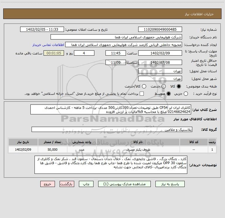شرح کلی نیاز: کاتلری ایران ایر CP54 طبق توضیحات-تعداد:100کارتن500 عددی -پرداخت 5 ماهه - کارشناس احمدی 02146624624 مبلغ با محاسبه 9%مالیات بر ارزش افزوده