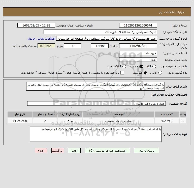 استعلام بارگیری1دستگاه راکتور400کیلوولت باظرفیت50مگاوار توسط جک در پست امیدیه2 و تخلیه در پست ایثار دائم در امیدیه با بیمه راکتور, استعلام بارگیری1دستگاه راکتور400کیلوولت باظرفیت50مگاوار توسط جک در پست امیدیه2 و تخلیه در پست ایثار دائم در امیدیه با بیمه راکتور
