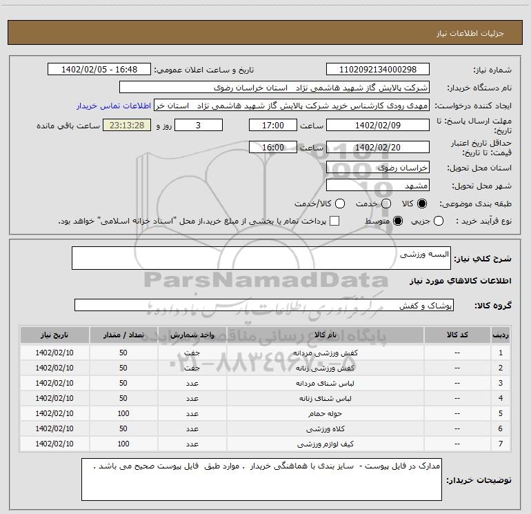 نام دستگاه خریدار:شرکت پالایش گاز شهید هاشمی نژاد استان خراسان رضوی