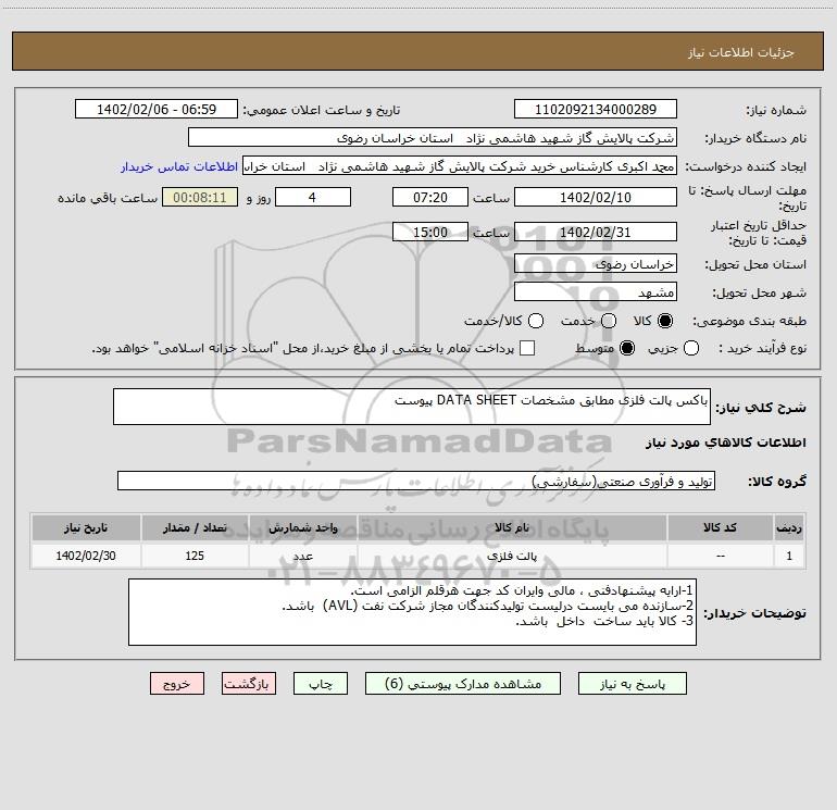 نام دستگاه خریدار:شرکت پالایش گاز شهید هاشمی نژاد استان خراسان رضوی
