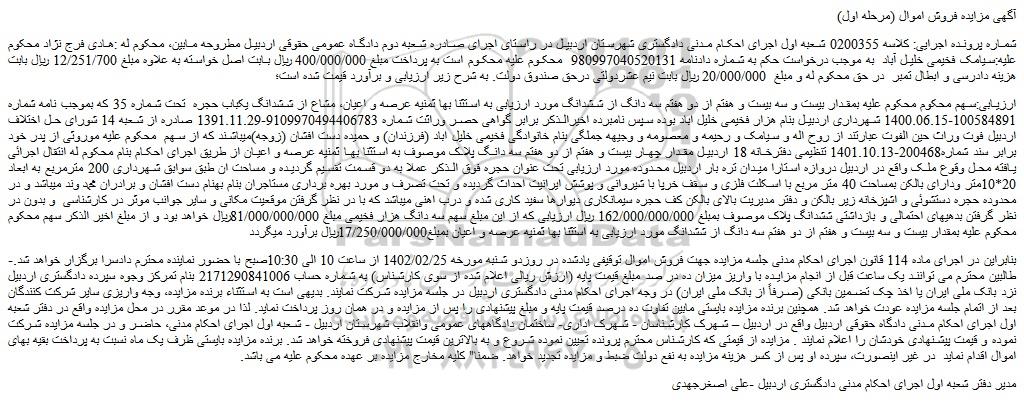 شماره پرونده اجرایی: کلاسه 0200355 شعبه اول اجرای احکام مدنی دادگستری شهرستان اردبیل در راستای اجرای صادره شعبه دوم دادگاه عمومی حقوقی اردبیل مطروحه مابین، محکوم له :هادی فرج نژاد محکوم علیه:سیامک فخیمی خلیل آباد  به موجب درخواست حکم به شماره دادنامه 980997040520131  محکوم علیه محکوم است به پرداخت مبلغ 400/000/000 ریال بابت اصل خواسته به علاوه مبلغ 12/251/700 ریال بابت هزینه دادرسی و ابطال تمبر  در حق محکوم له و مبلغ  20/000/000 ریال بابت نیم عشردولتی درحق صندوق دولت. به شرح زیر ارزیابی و برآورد قیمت شده است؛