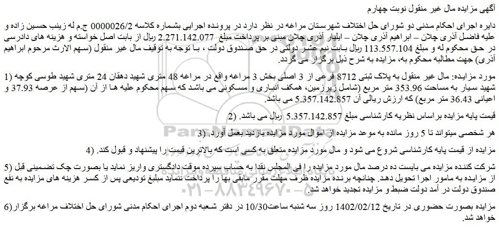 دایره اجرای احکام مدنی دو شورای حل اختلاف شهرستان مراغه در نظر دارد در پرونده اجرایی بشماره کلاسه 0000026/2 ج.م له زینب حسین زاده و علیه فاضل آذری چلان – ابراهیم آذری چلان – ایلیار آذری چلان مبنی بر پرداخت مبلغ 2.271.142.077 ریال از بابت اصل خواسته و هزینه های دادرسی در حق محکوم له و مبلغ 113.557.104 ریال بابت نیم عشر دولتی در حق صندوق دولت ، با توجه به توقیف مال غیر منقول (سهم الارث مرحوم ابراهیم آذری) جهت مطالبه محکوم به، مزایده به شرح ذیل برگزار می گردد.