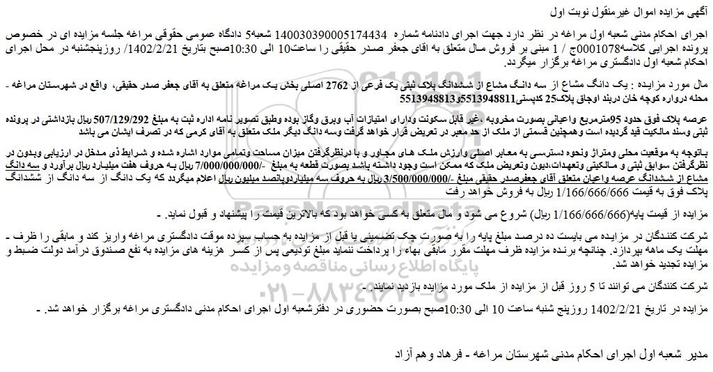 - مزایده در تاریخ 1402/2/21 روزپنج شنبه ساعت 10 الی 10:30صبح بصورت حضوری در دفترشعبه اول اجرای احکام مدنی دادگستری مراغه برگزار خواهد شد.