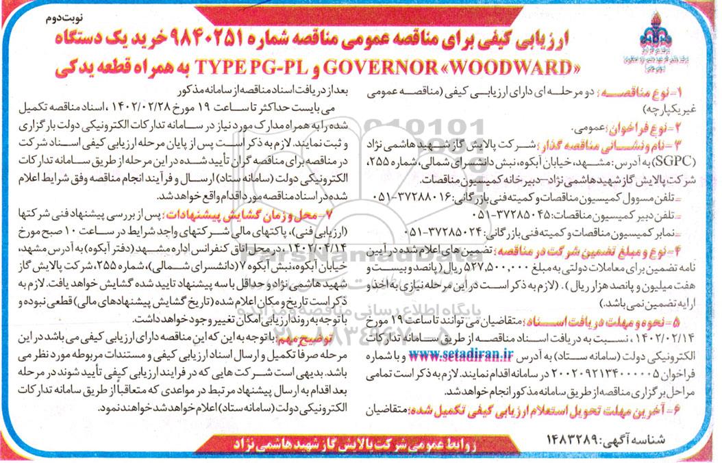 مناقصه شماره 9840251 خرید یکدستگاه GOVERNOR WOODWARD و TYPE PG-PL به همراه قطعه یدکی