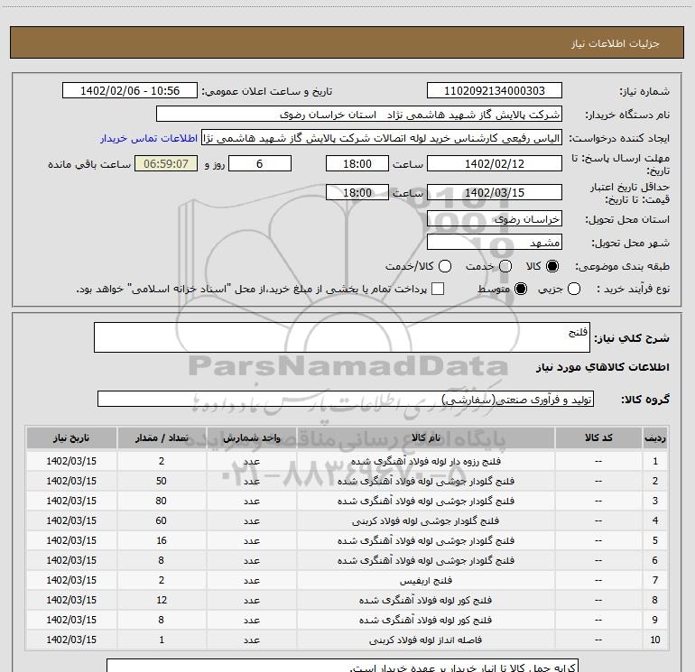 | 9 | -- | فلنج کور لوله فولاد آهنگری شده | عدد | 8 | 1402/03/15 |