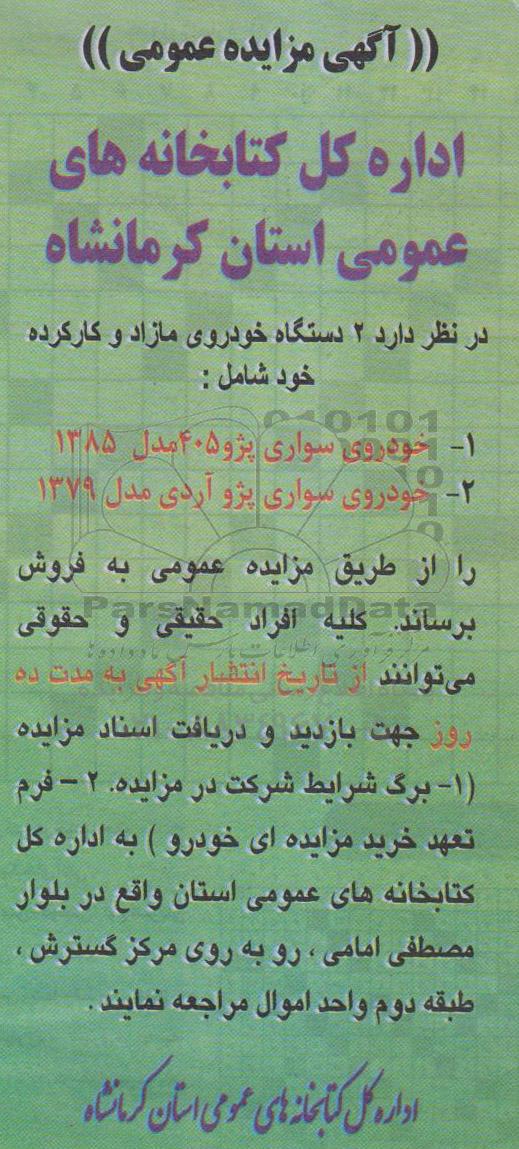 را از طریق مزایده عمومی به فروش برساند. کلیه افراد حقیقی و حقوقی می توانند از تاریخ انتشار آگهی به مدت ده روز جهت بازدید و دریافت اسناد مزایده (1- برگ شرایط شرکت در مزایده 2- فرم تعهد خرید مزایده ای خودرو) به اداره کل کتابخانه های عمومی استان واقع در بلوار مصطفی امامی، روبه روی مرکز گسترش، طبقه دوم واحد اموال مراجعه نمایند.