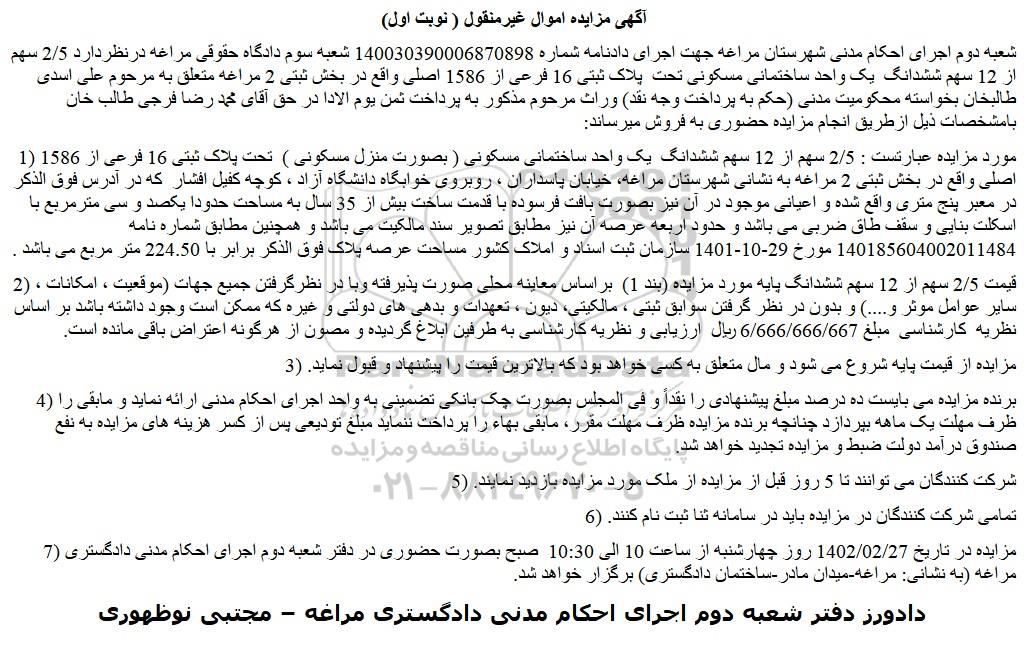 شعبه دوم اجرای احکام مدنی شهرستان مراغه جهت اجرای دادنامه شماره 140030390006870898 شعبه سوم دادگاه حقوقی مراغه درنظردارد 2/5 سهم از 12 سهم ششدانگ یک واحد ساختمانی مسکونی تحت پلاک ثبتی 16 فرعی از 1586 اصلی واقع در بخش ثبتی 2 مراغه متعلق به مرحوم علی اسدی طالبخان بخواسته محکومیت مدنی (حکم به پرداخت وجه نقد) وراث مرحوم مذکور به پرداخت ثمن یوم الادا در حق آقای محمد رضا فرجی طالب خان بامشخصات ذیل ازطریق انجام مزایده حضوری به فروش میرساند: