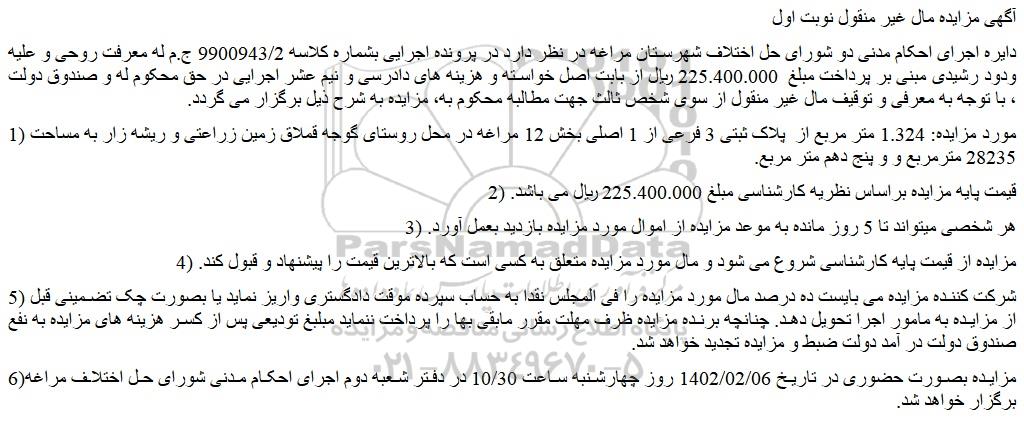 دایره اجرای احکام مدنی دو شورای حل اختلاف شهرستان مراغه در نظر دارد در پرونده اجرایی بشماره کلاسه 9900943/2 ج.م له معرفت روحی و علیه ودود رشیدی مبنی بر پرداخت مبلغ 225.400.000 ریال از بابت اصل خواسته و هزینه های دادرسی و نیم عشر اجرایی در حق محکوم له و صندوق دولت ، با توجه به معرفی و توقیف مال غیر منقول از سوی شخص ثالث جهت مطالبه محکوم به، مزایده به شرح ذیل برگزار می گردد.