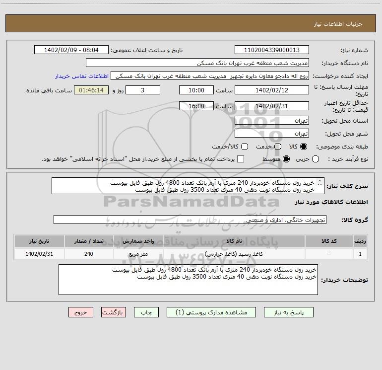 نام دستگاه خریدار:مدیریت شعب منطقه غرب تهران بانک مسکن