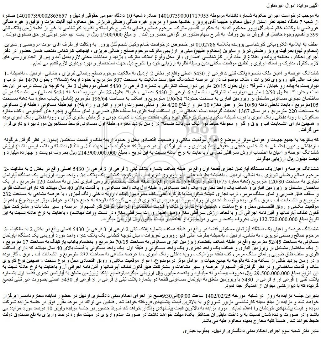 به موجب درخواست اجرای حکم به شماره دادنامه مربوطه 140107390001717955 صادره شعبه 10 دادگاه عمومی حقوقی اردبیل و 140107390002865657 صادره از شعبه 7 دادگاه تجدید نظر استان اردبیل محکوم علیهما آقای پرویز و خانمها حمیرا و مریم و غیره همگی رضائی تبریزدر حق محکوم لهم آقایت عزت و توفیق و غیره همگی عروضی با وکالت خانم شبنم گل پرور محکوم اند به به حکم بر تقسیم ماترک مرحوم صالح رضایی به شرح خواسته و نظریه کارشناسی به غیر از قطعه زمین پلاک ثبتی 399 و تقسیم وجوه حاصل از فروش ما بین وراث به شرح سهام مذکور در گواهی حصر وراثت . و مبلغ 1/500/000 ریال از بابت نیم عشر دولتی در حق صندوق دولت .