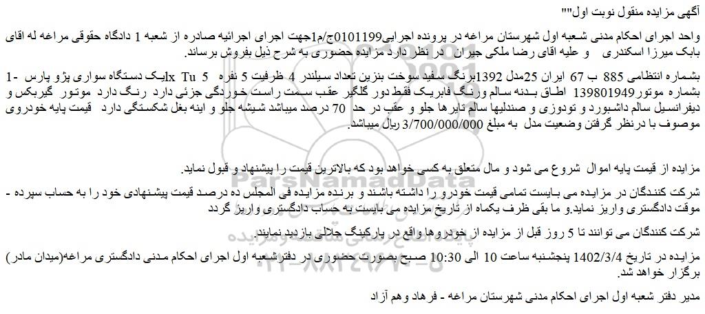 واحد اجرای احکام مدنی شعبه اول شهرستان مراغه در پرونده اجرایی0101199ج/م1جهت اجرای اجرائیه صادره از شعبه 1 دادگاه حقوقی مراغه له اقای بابک میرزا اسکندری و علیه اقای رضا ملکی جیران در نظر دارد مزایده حضوری به شرح ذیل بفروش برساند.