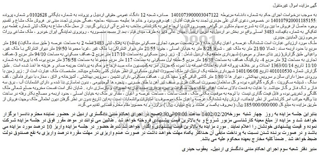 به موجب درخواست اجرای حکم به شماره دادنامه مربوطه 1401073900003047122 صادره شعبه 12 دادگاه عمومی حقوقی اردبیل و پرونده به شماره بایگانی 0102628 و شماره پرونده :140107920001185155 در خصوص دعوی آقای علی حیدری تجدد به طرفیت آقایان : محمد،رفیع،ودود و خانم ها :ملیحه ،صدیقه ،حاجیه ،همگی حیدری تجدد مبنی بر فروش ملک مشاع و تقسیم وجوه حاصل از فروش ما بین وراث به شرح سهام مذکور در گواهی حصر وراثت با ارجاع امر به کارشناس منتخب به شرح آتی ارزیابی گردید:. از محل ملک مشاع به پلاک ثبتی شماره :قطعه دوم تفکیکی به شماره باقیمانده 3483 اصلی واقع در بخش دو اردبیل به آدرس اردبیل : میدان عالی قاپو به طرف میدان قیام ، بعد از مسجد منصوریه ، روبروی نمایندگی ایران خودرو ، ملک مشاعی وراث مرحوم زین العابدین حیدری