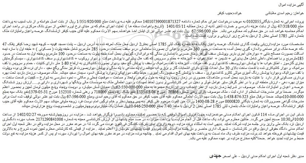 پرونده اجرایی به شماره بایگانی0102055 به موجب درخواست اجرای حکم شماره دادنامه 140107390001871327 محکوم علیه ــپرداخت ﻣﺒﻠﻎ 1/351/920/000 رﯾﺎل از بابت اصل خواسته و از باب تسبیب به پرداخت مبلغ 47/318/000 ریال از بابت هزینه دادرسی و خسارت تاخیر تادیه از زمان مطالبه 1401/05/11  (تاریخ واخواست سفته ها )  لغایت اجرای حکم که بر مبنای نرخ تورم اعلامی از سوی بانک مرکزی در واحد اجرای احکام محاسبه خواهد شد در حق محکوم له، محکوم می باشد.  مبلغ 67/596/000  ریال بابت نیم عشر دولتی نیز از ایشان اخذ خواهدشد.سهم الارث محکوم علیه آقای حبیب کیافر ازششدانگ عرصه واعیان وامتیازات ملک بشماره ثبتی 1785 اصلی بخش 2 اردبیل به شرح زیر ارزیابی و برآورد قیمت شده است.