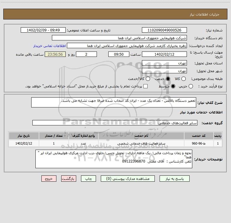 شرح کلی نیاز: تعمیر دستگاه بالانس - تعداد یک عدد - ایران کد انتخاب شده صرفا جهت تشابه می باشد.