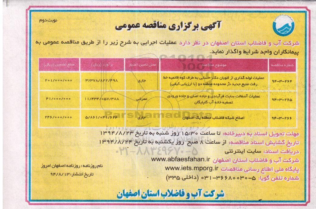 شرکت آب و فاضلاب استان اصفهان در نظر دارد عملیات اجرایی به شرح زیر را از طریق مناقصه عمومی به پیمانکاران واجد شرایط واگذار نماید