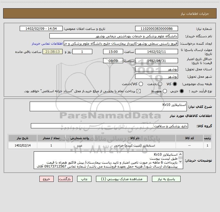 توضیحات خریدار:استابیلایزر Kv10 طبق لیست پیوست بازپرداخت 6 ماهه در صورت تامین اعتبار و تایید ریاست بیمارستان/ پیش فاکتور همراه با قیمت پیشنهادی ارسال شود/ هزینه حمل بعهده فروشنده می باشد/ شماره تماس 09173712567 آقای راستی کد مشابه