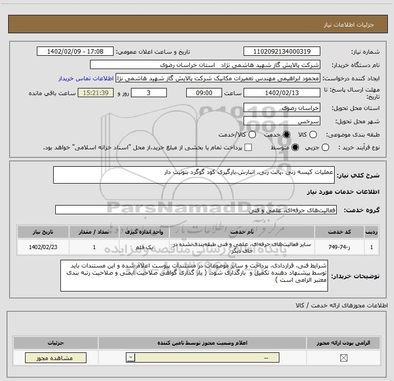 نام دستگاه خریدار:شرکت پالایش گاز شهید هاشمی نژاد استان خراسان رضوی