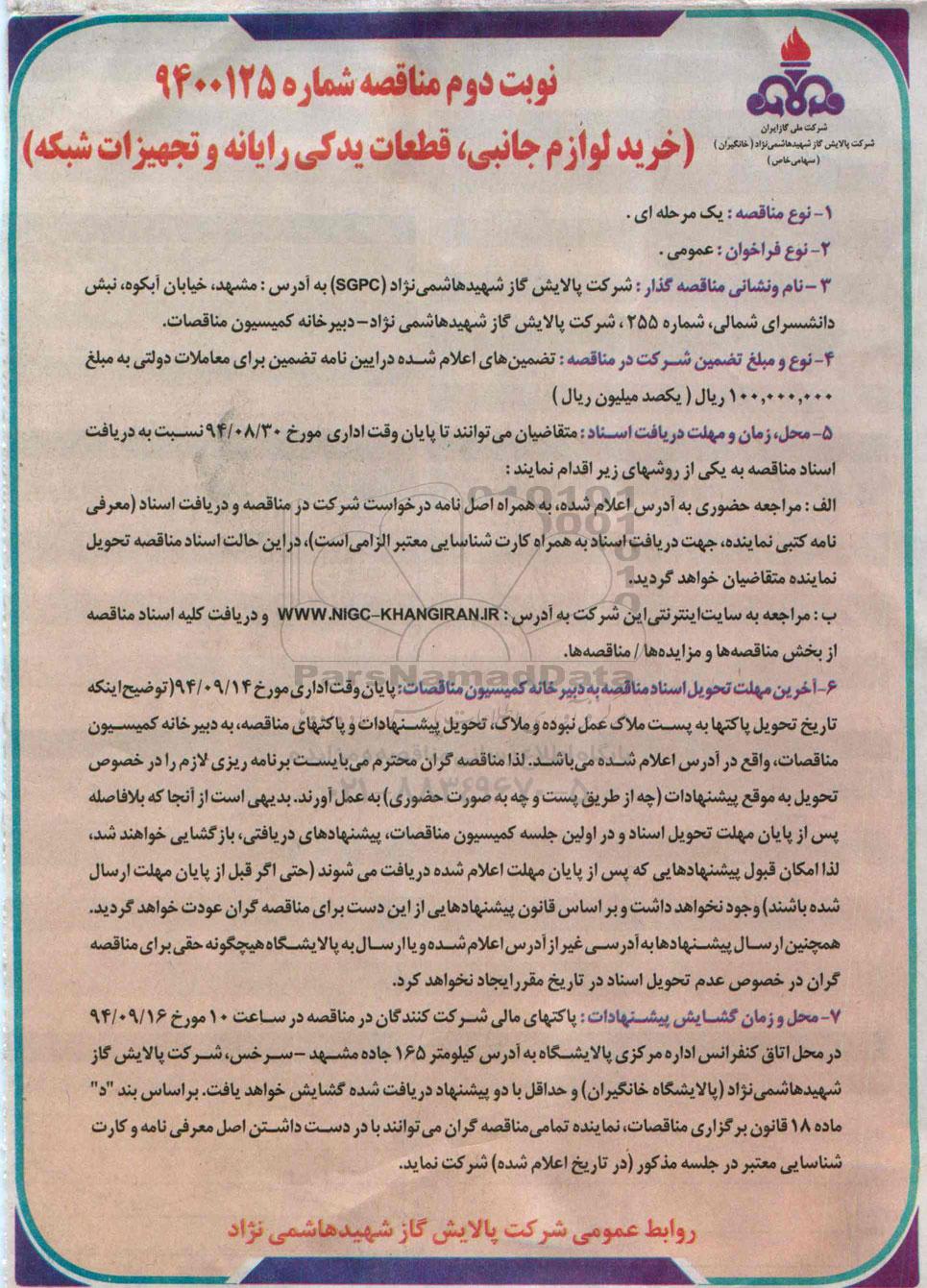 محل و زمان گشایش پیشنهادات پاکتهای مالی شرکت کنندگان در مناقصه در ساعت 10 مورخ 94.9.16 در محل اتاق کنفرانس اداره مرکزی پالایشگاه به آدرس کیلومتر 165 جاده مشهد -سرخس ، شرکت پالایش گاز شهید هاشمی نژاد (پالایشگاه خانگیران ) و حداقل با دو پیشنهاد دریافت شده گشایش خواهد یافت بر اساس بند د ماده 18 قانون برگزاری مناقصات نماینده تمامی مناقصه گران می توانند با در دست داشتن اصل معرفی نامه و کارت شناسایی معتبر در جلسه مذکور (در تاریخ اعلام شده )شرکت نماید .