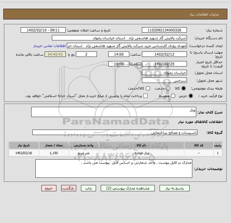 | 1 | -- | ورق فولادی | متر مربع | 1,150 | 1402/02/16 |