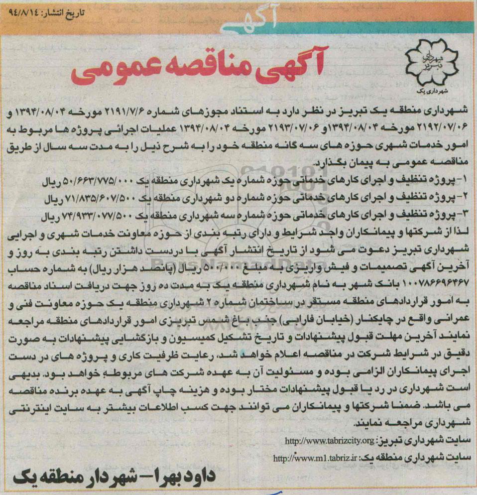 شهرداری منطقه یک تبریز در نظر دارد عملیات اجرائی پروژه ها مربوط به امور خدمات شهری حوزه های سه گانه منطقه خود را به شرح ذیل را به مدت سه سال از طریق مناقصه عمومی به پیمان بگذارد.