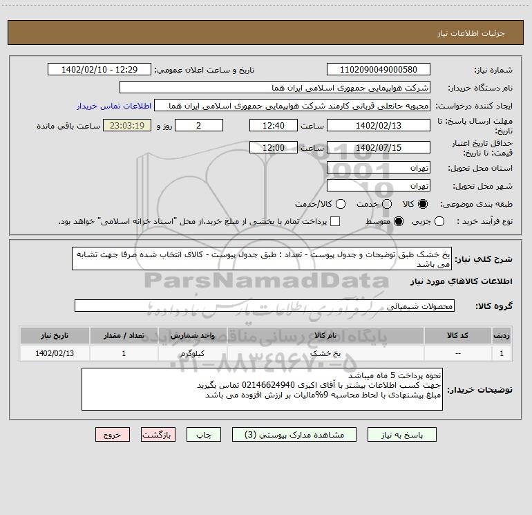 شرح کلی نیاز: یخ خشک طبق توضیحات و جدول پیوست - تعداد : طبق جدول پیوست - کالای انتخاب شده صرفا جهت تشابه می باشد