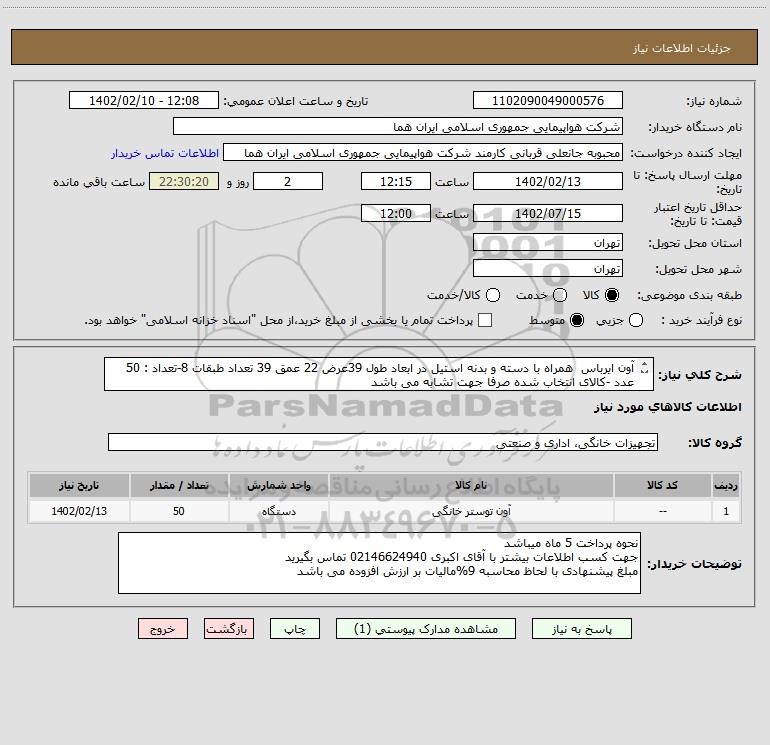 شرح کلی نیاز: آون ایرباس همراه با دسته و بدنه استیل در ابعاد طول 39عرض 22 عمق 39 تعداد طبقات 8-تعداد : 50 عدد -کالای انتخاب شده صرفا جهت تشابه می باشد
