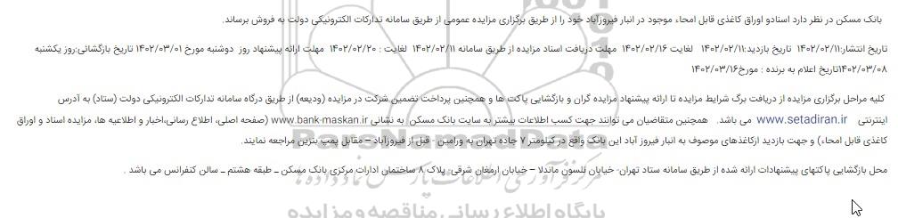 کلیه مراحل برگزاری مزایده از دریافت برگ شرایط مزایده تا ارائه پیشنهاد مزایده گران و بازگشایی پاکت ها و همچنین پرداخت تضمین شرکت در مزایده (ودیعه) از طریق درگاه سامانه تدارکات الکترونیکی دولت (ستاد) به آدرس اینترنتیwww.setadiran.ir می باشد.   همچنین متقاضیان می توانند جهت کسب اطلاعات بیشتر به سایت بانک مسکن  به نشانی www.bank-maskan.ir (صفحه اصلی، اطلاع رسانی،اخبار و اطلاعیه ها، مزایده اسناد و اوراق کاغذی قابل امحاء) و جهت بازدید ازکاغذهای موصوف به انبار فیروز آباد این بانک واقع در کیلومتر 7 جاده تهران به ورامین - قبل از فیروزآباد – مقابل پمپ بنزین مراجعه نمایند.
