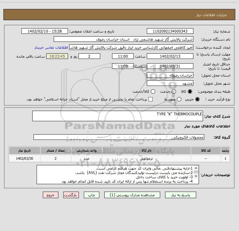 شرح کلی نیاز: TYPE "K" THERMOCOUPLE