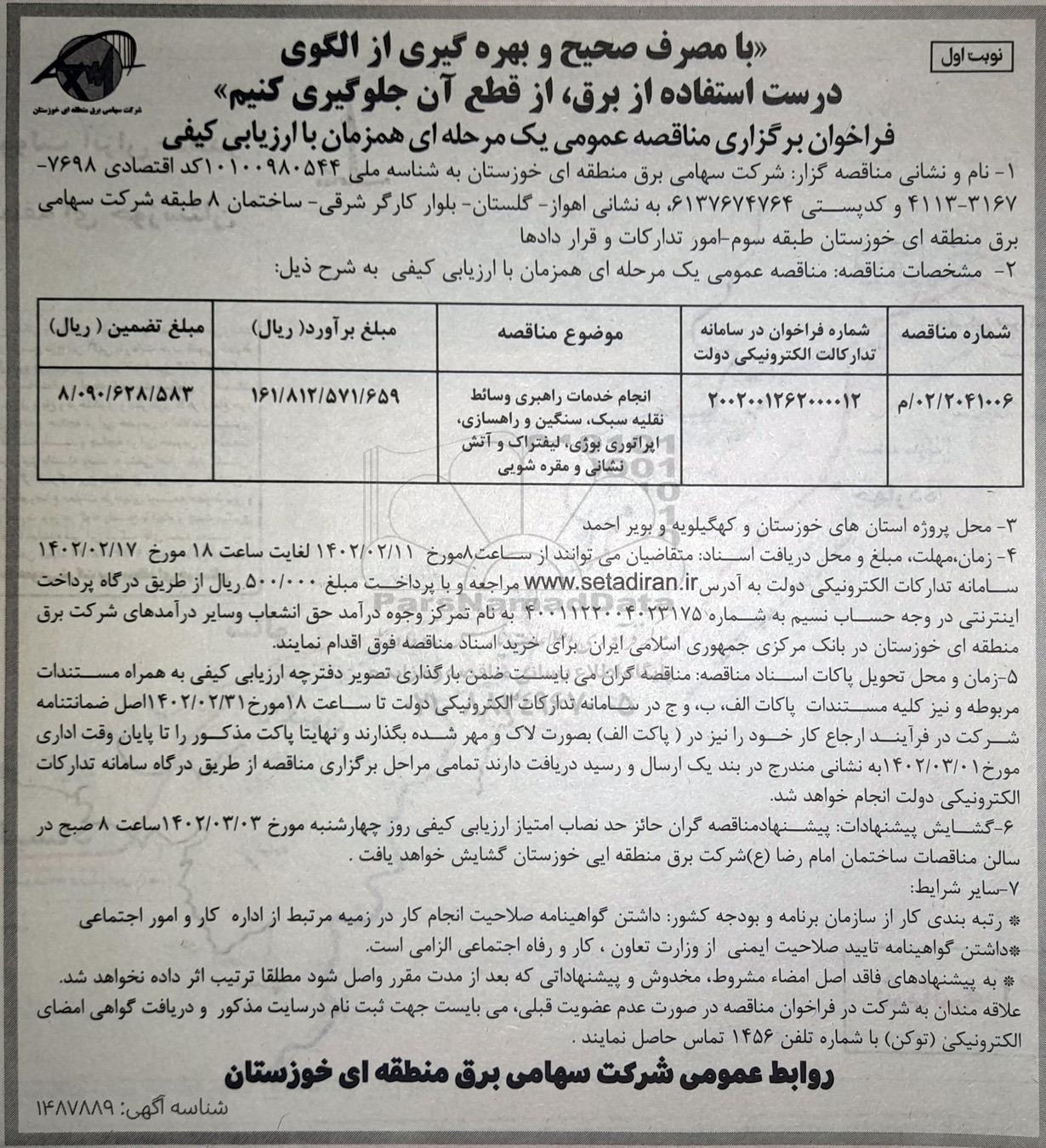 گشایش پیشنهادات پیشنهاد مناقصه گران حائز حد انصاب امتیاز ارزیابی کیفی روز چهارشنبه 1402.3.3 ساعت 8 صبح در سالن مناقصات ساختمان امام رضا شرکت برق منطقه ای خوزستان گشایش خواهد یافت