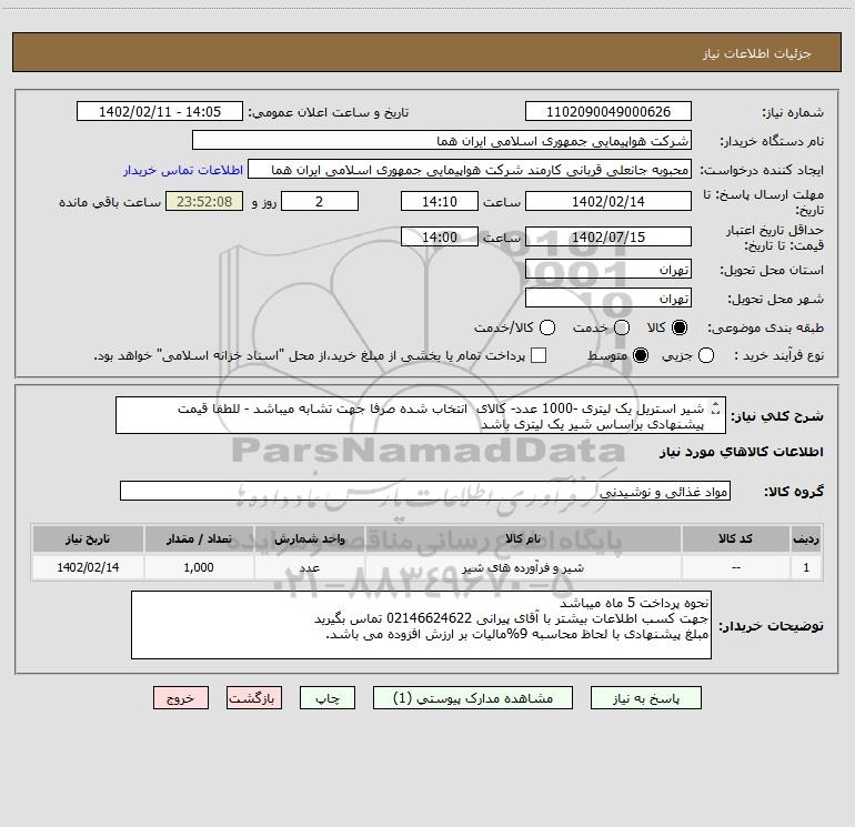 شرح کلی نیاز: شیر استریل یک لیتری -1000 عدد- کالای انتخاب شده صرفا جهت تشابه میباشد - للطفا قیمت پیشنهادی براساس شیر یک لیتری باشد