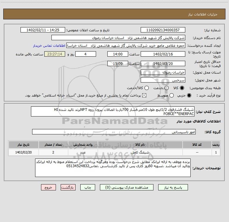 نام دستگاه خریدار:شرکت پالایش گاز شهید هاشمی نژاد استان خراسان رضوی