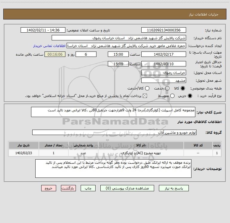 نام دستگاه خریدار:شرکت پالایش گاز شهید هاشمی نژاد استان خراسان رضوی
