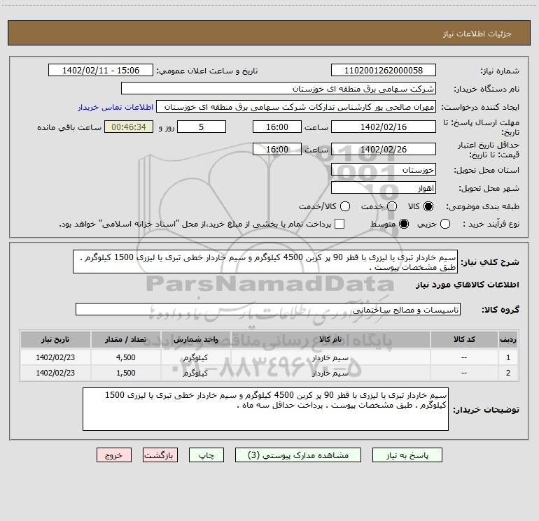 توضیحات خریدار:سیم خاردار تبری یا لیزری با قطر 90 پر کربن 4500 کیلوگرم و سیم خاردار خطی تبری یا لیزری 1500 کیلوگرم . طبق مشخصات پیوست . پرداخت حداقل سه ماه .