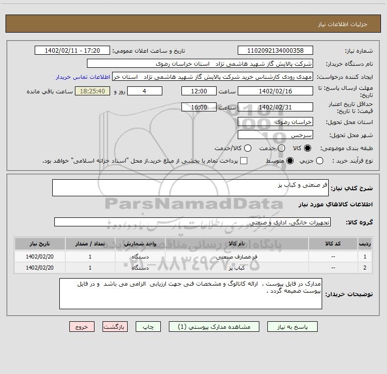 نام دستگاه خریدار:شرکت پالایش گاز شهید هاشمی نژاد استان خراسان رضوی