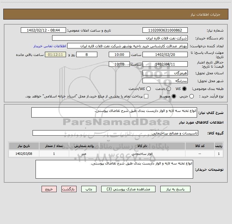 توضیحات خریدار:انواع تخته سه لایه و الوار داربست بندی طبق شرح تقاضای پیوستی.