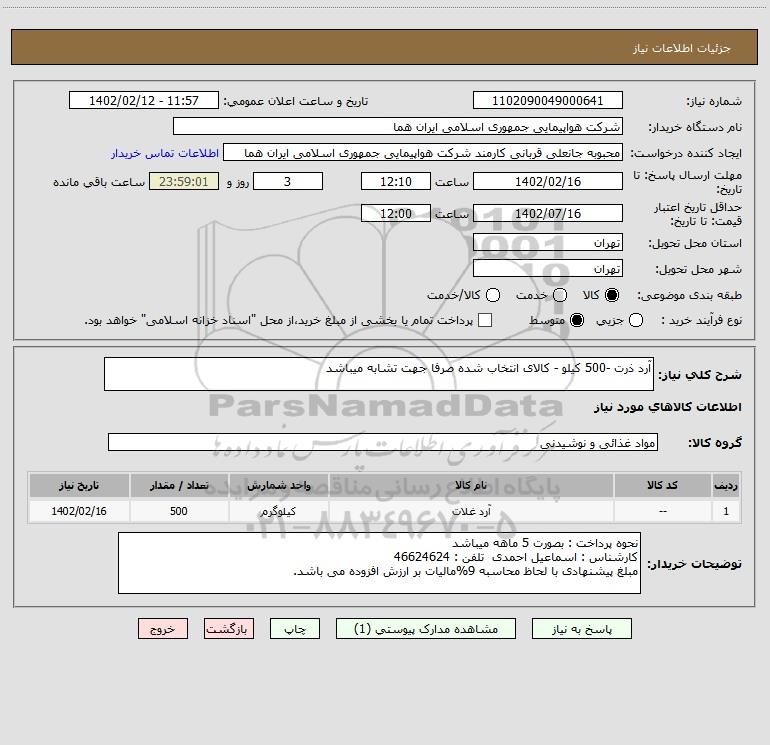 | 1 | -- | آرد غلات | کیلوگرم | 500 | 1402/02/16 |