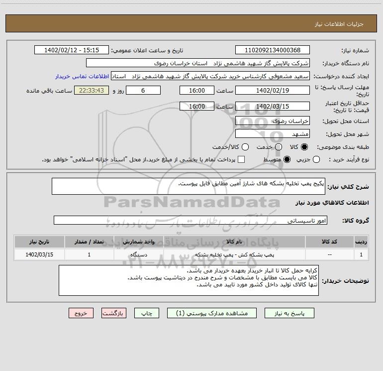 نام دستگاه خریدار:شرکت پالایش گاز شهید هاشمی نژاد استان خراسان رضوی