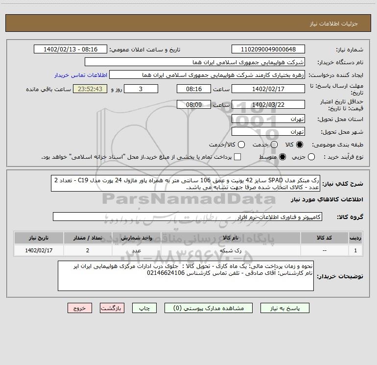 استعلام رک مبتکر مدل SPAD سایز 42 یونیت و عمق 106 سانتی متر به همراه پاور ماژول 24 پورت مدل C19 - تعداد 2 عدد - کالای انتخاب شده صرفا جهت تشابه می باشد., استعلام رک مبتکر مدل SPAD سایز 42 یونیت و عمق 106 سانتی متر به همراه پاور ماژول 24 پورت مدل C19 - تعداد 2 عدد - کالای انتخاب شده صرفا جهت تشابه می باشد.