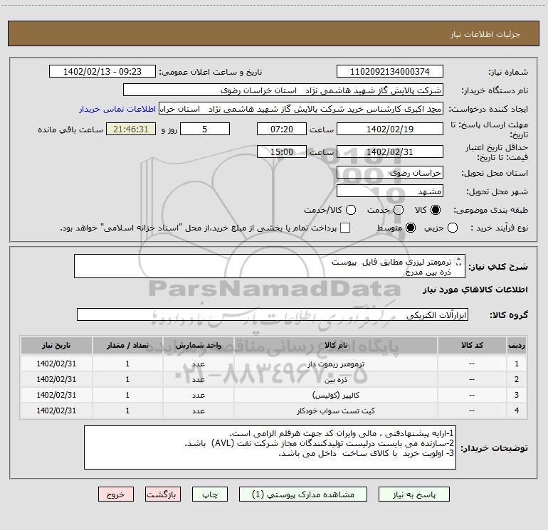 نام دستگاه خریدار:شرکت پالایش گاز شهید هاشمی نژاد استان خراسان رضوی