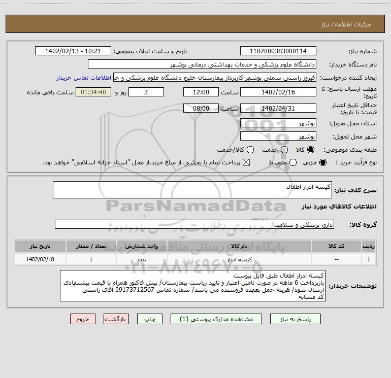 توضیحات خریدار:کیسه ادرار اطفال طبق فایل پیوست بازپرداخت 6 ماهه در صورت تامین اعتبار و تایید ریاست بیمارستان/ پیش فاکتور همراه با قیمت پیشنهادی ارسال شود/ هزینه حمل بعهده فروشنده می باشد/ شماره تماس 09173712567 آقای راستی کد مشابه