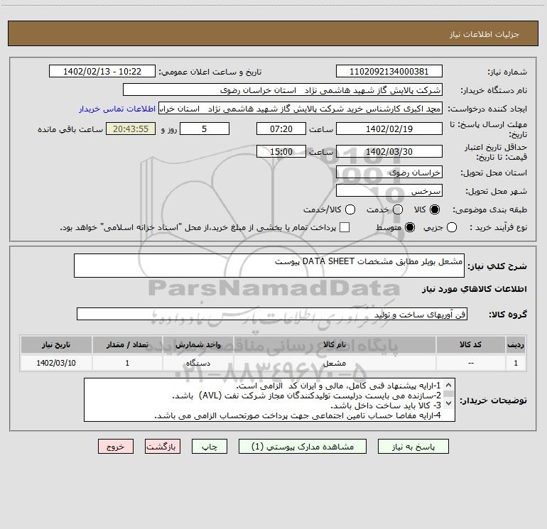 شرح کلی نیاز: مشعل بویلر مطابق مشخصات DATA SHEET پیوست