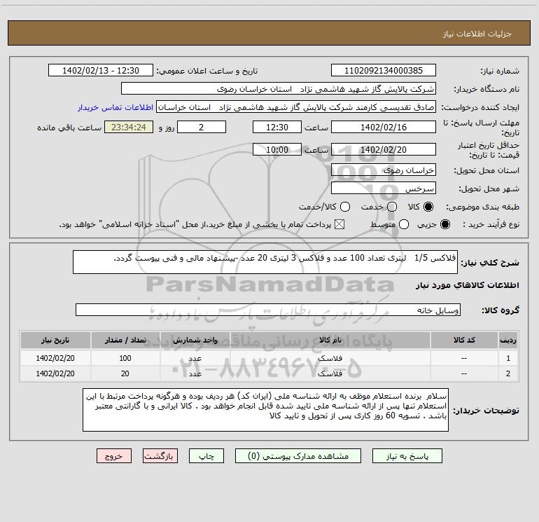 شرح کلی نیاز: فلاکس 1/5 لیتری تعداد 100 عدد و فلاکس 3 لیتری 20 عدد -پیشنهاد مالی و فنی پیوست گردد.