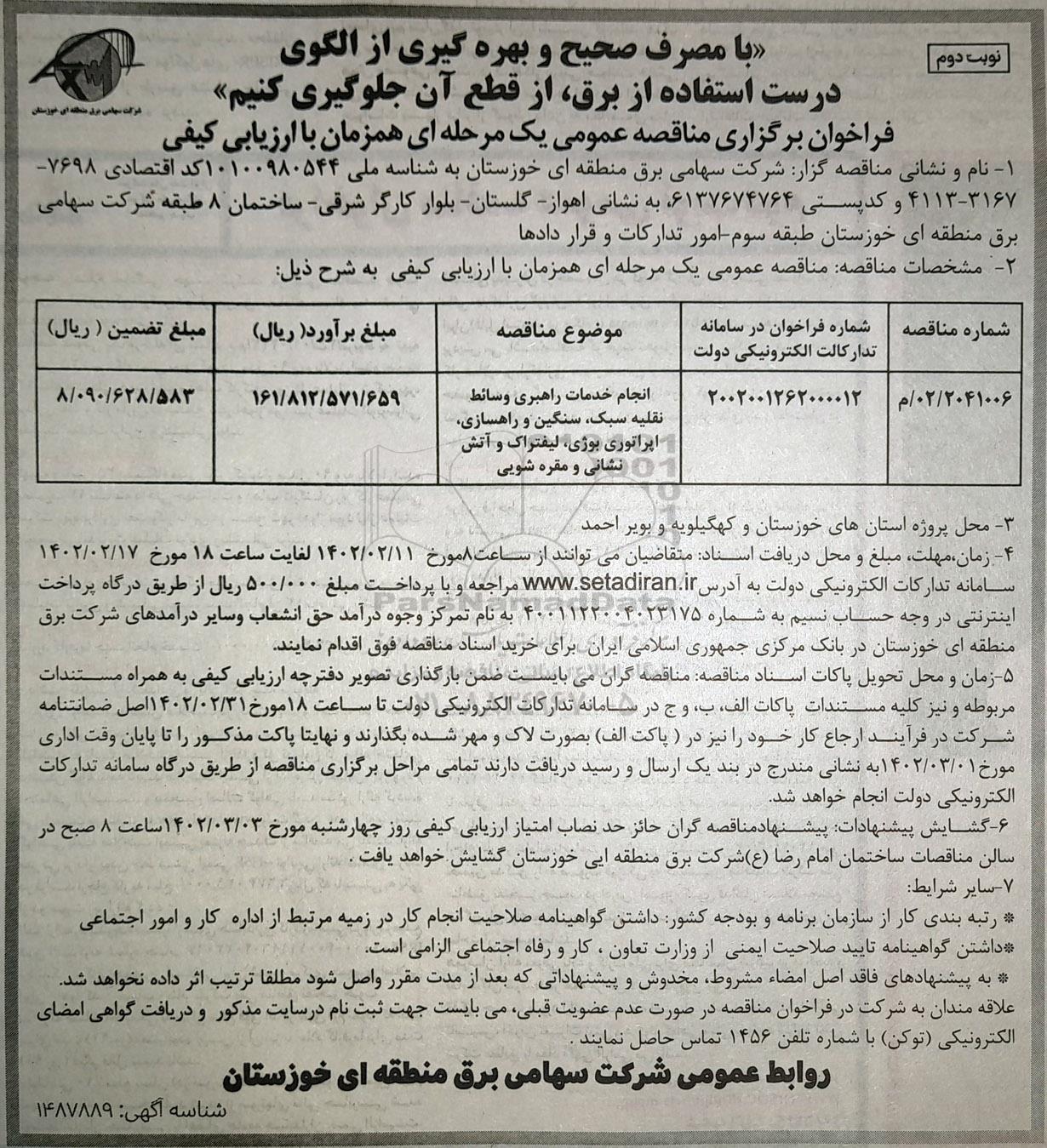 4. مهلت، مبلغ و محل دریافت اسناد: متقاضیان می توانند از ساعت 8 تاریخ 1402.2.11 لغایت ساعت 18 مورخ 1402.2.17 به سامانه تدارکات الکترونیکی دولت به آدرس ستاد مراجعه و با پرداخت مبلغ 500.000 ریال از طریق درگاه پرداخت اینترنتی در وجه حساب نسیم به شماره 4001122004023175 به نام تمرکز وجوه درامد حق انشعاب و سایر درآمدهای شرکت سهامی برق منطقه ای خوزستان در بانک مرکزی جمهوری اسلامی ایران برای خرید اسناد مناقصه فوق اقدام نمایند