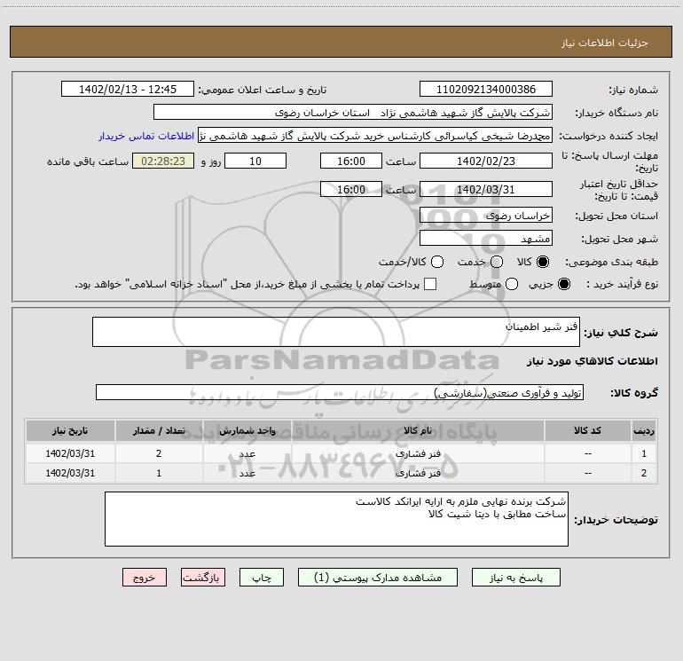نام دستگاه خریدار:شرکت پالایش گاز شهید هاشمی نژاد استان خراسان رضوی