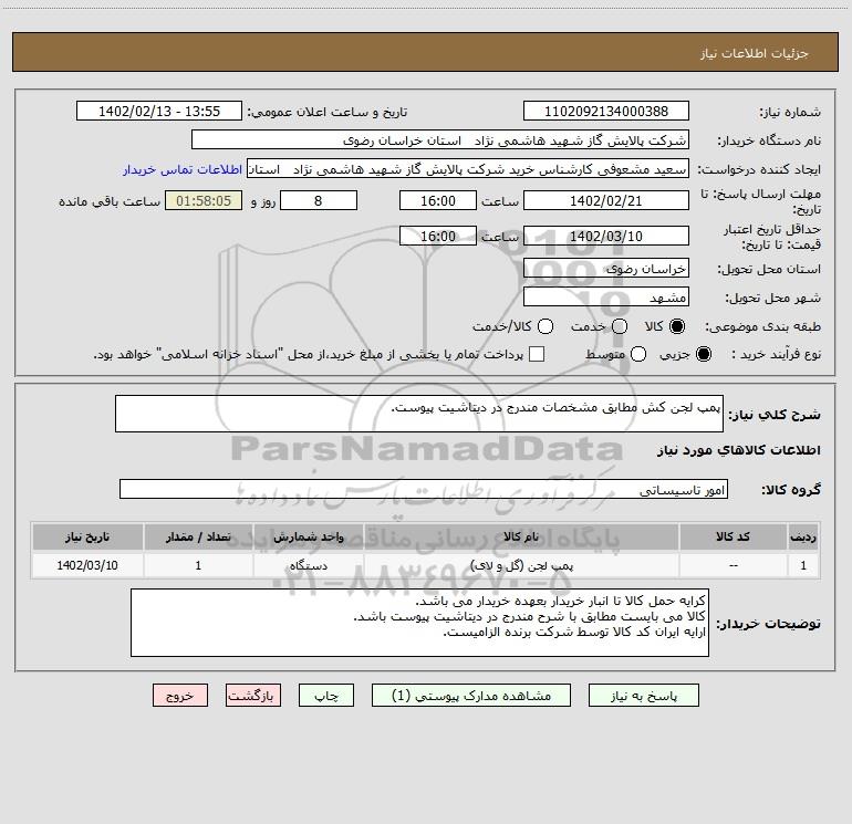 شرح کلی نیاز: پمپ لجن کش مطابق مشخصات مندرج در دیتاشیت پیوست.