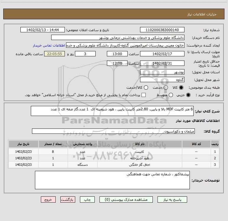 شرح کلی نیاز: 6 متر کابینت MDF بالا و پایین، 2.80متر کابینت پایین ، هود شومینه ای 1 عدد،گاز صفه ای 1 عدد